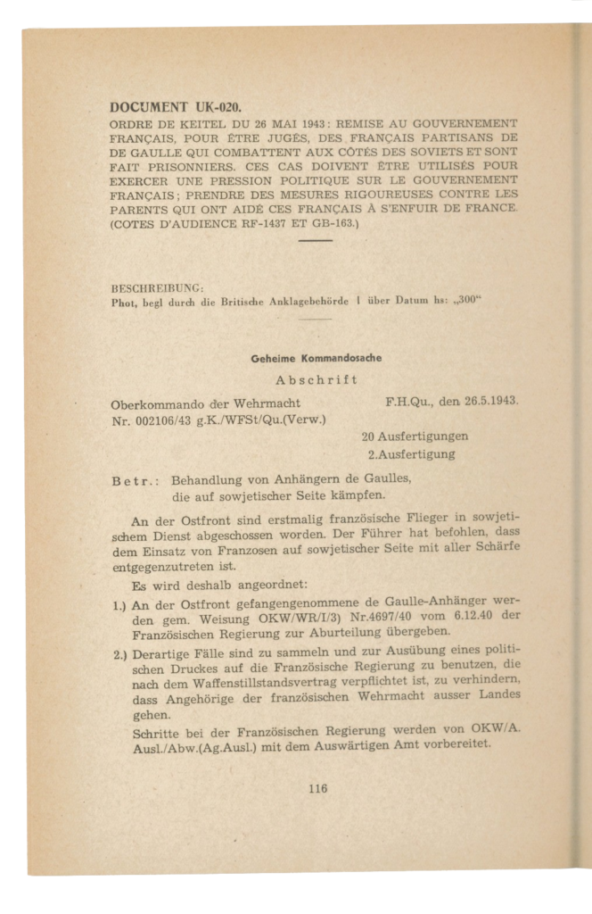 1.) Les partisans de De Gaulle capturés sur le front de l’Est soient remis au gouvernement français pour jugement conformément à la directive (OKW/WR/I/3) n°4697/40 du 6 décembre 1940.