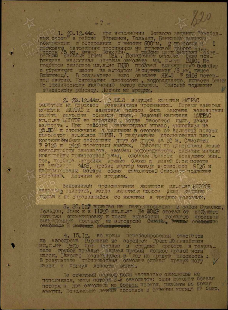 2/ 23.12.44. 2 Yak-3, leader capitaine MATRAS ont décollé pour intercepter des avions de reconnaissances ennemis. Le décollage du capitaine MATRAS, a entraîné la formation d’un nuage de poussière sur la piste. N’attendant pas que ce nuage se dissipe, le Lt BLETON, a commencé à décoller. Lors de la course d’envol, il s’est dévié vers la droite, de 25-30° et est entré en collision avec l’avion de l’Aspirant PERRIN qui roulait sur le côté de la piste. Les avions n ° 9126 et 2426 se sont percutés et ont terminé leurs course 30 m plus loin. Les flancs gauches des deux avions ont été sectionnés sur la partie central, les radiateurs à eau ont été percés, les supports inférieurs sous le cadre du moteur ont été brisés , les pales des hélices ont aussi été détruites, le carter moteur de l’avion 9126 a été percé et les moteurs des deux avions ont détériorés. Les avions doivent être radiés. Les pilotes sont indemnes.